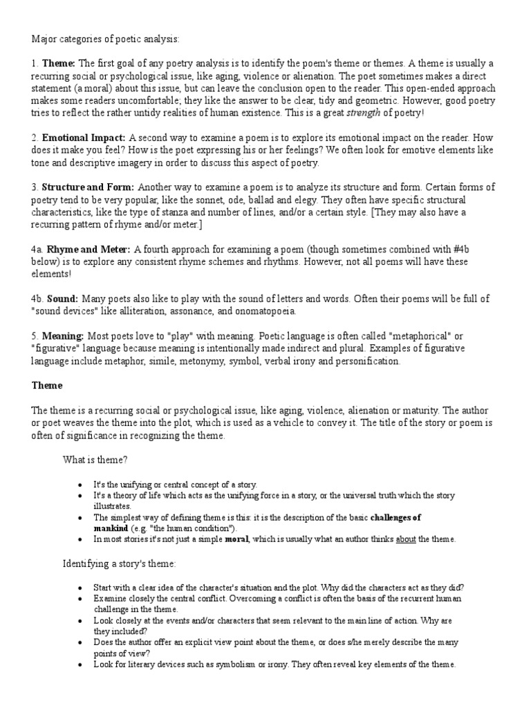1. Theme: The first goal of any poetry analysis is to identify the poem's theme or themes. A theme is usually a