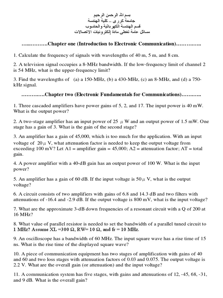 ﻣﺴﺎﺋﻞ ﻋﺎﻣﺔ ﺗﻐﻄﻰ ﻣﺎﺩﺓ ﺇﻟﻜﺘﺮﻭﻧﻴﺎﺕ ﺍﻻﺗﺼﺎﻻﺕ