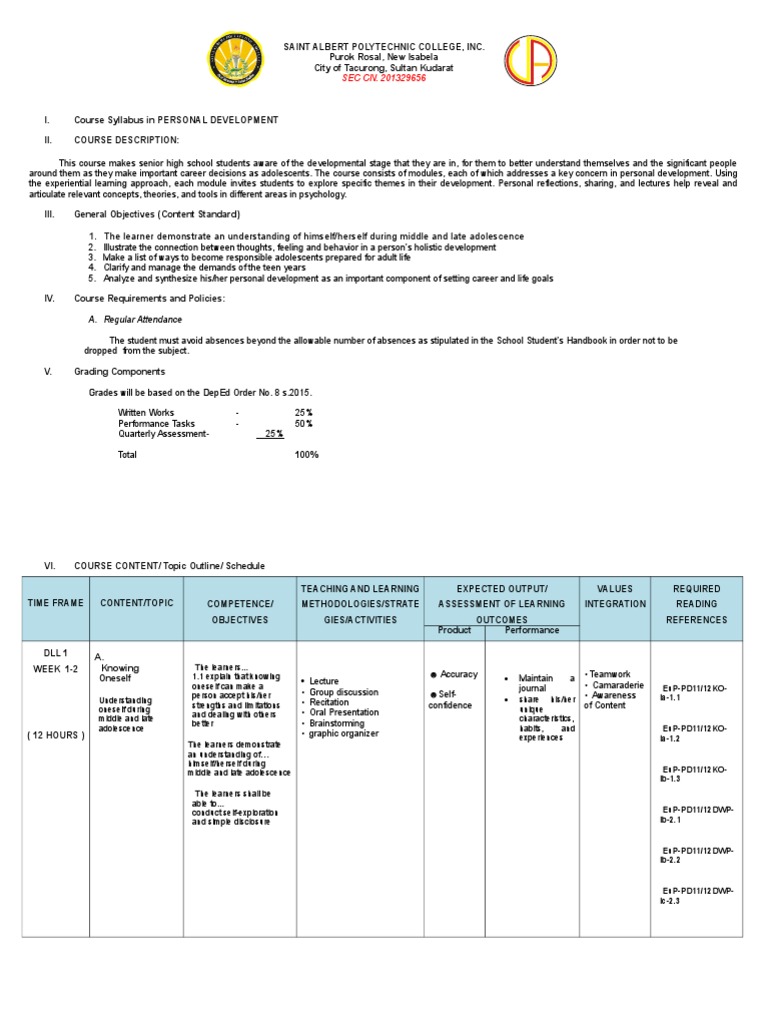 I. Course Syllabus in PERSONAL DEVELOPMENT