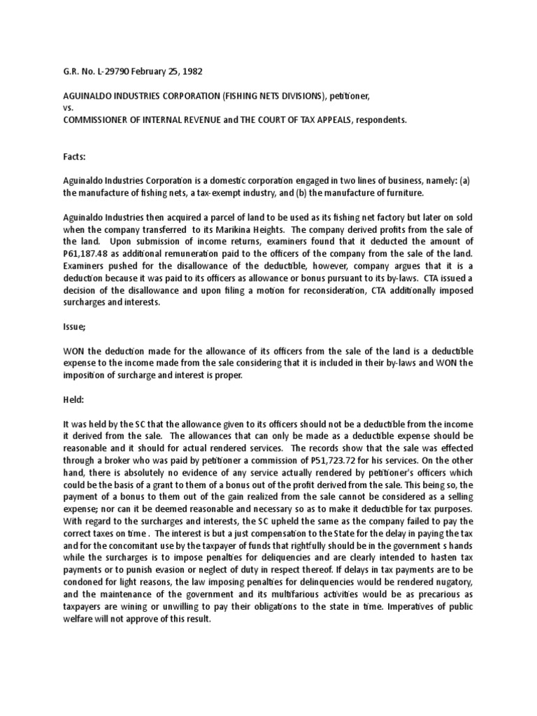 Aguinaldo Industries Corporation is a domestic corporation engaged in two lines of business, namely: (a)