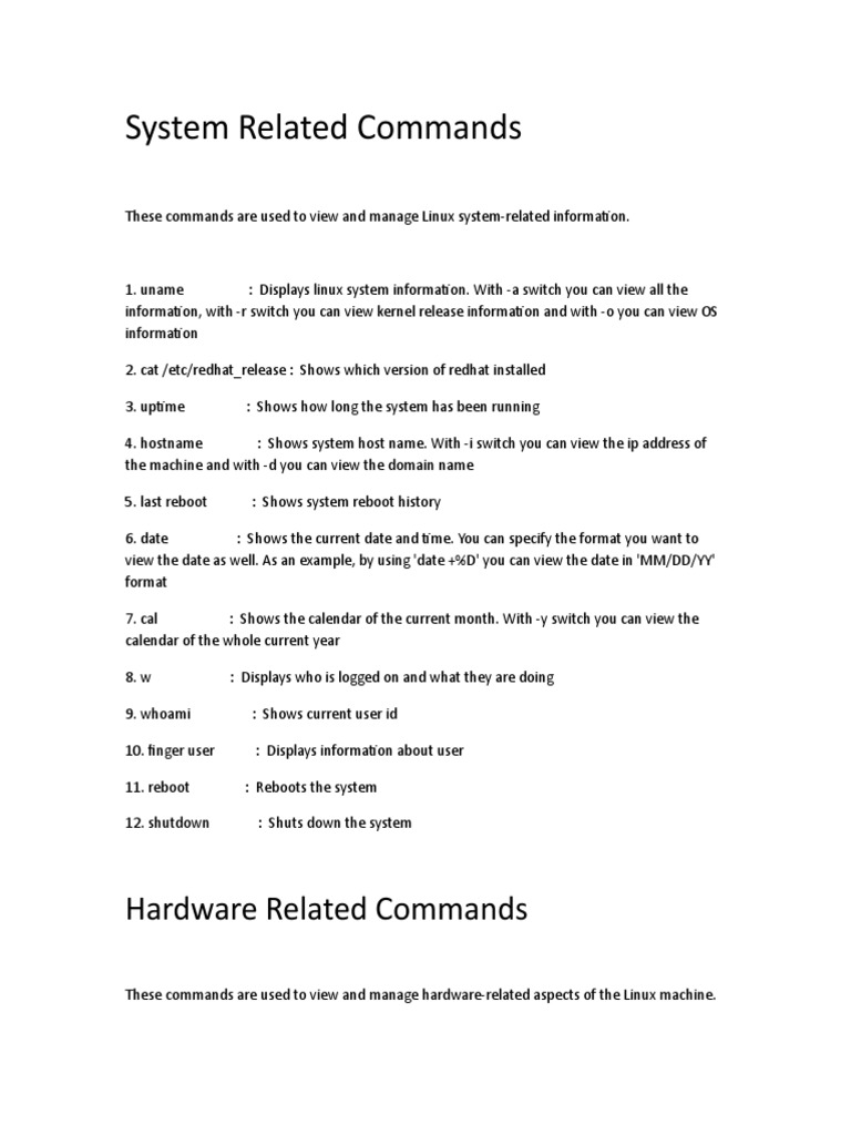 These commands are used to view and manage hardware-related aspects of the Linux machine.