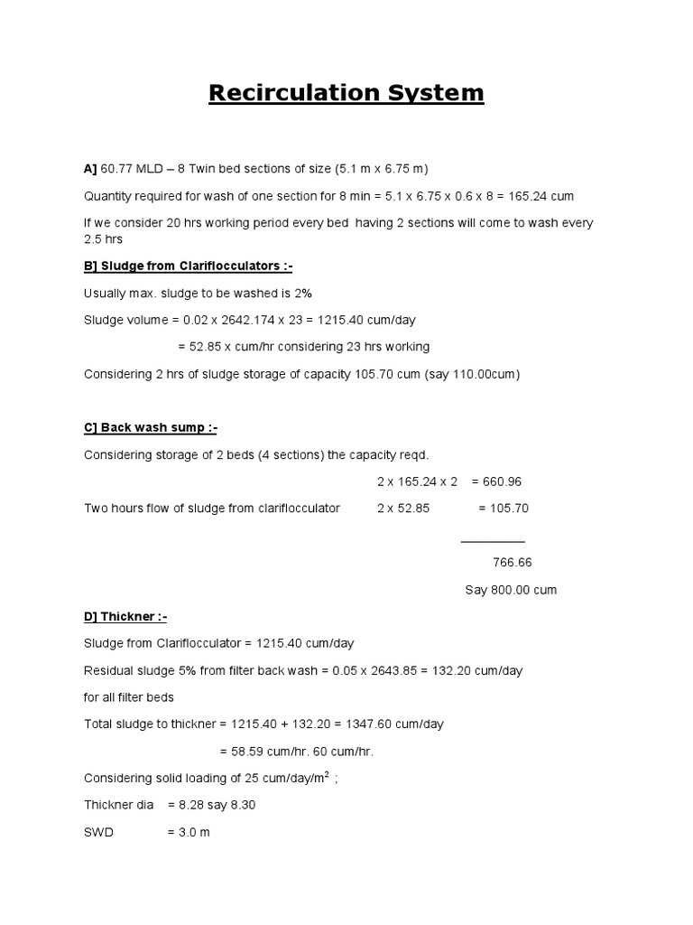 Residual sludge 5% from filter back wash = 0.05 x 2643.85 = 132.20 cum/day