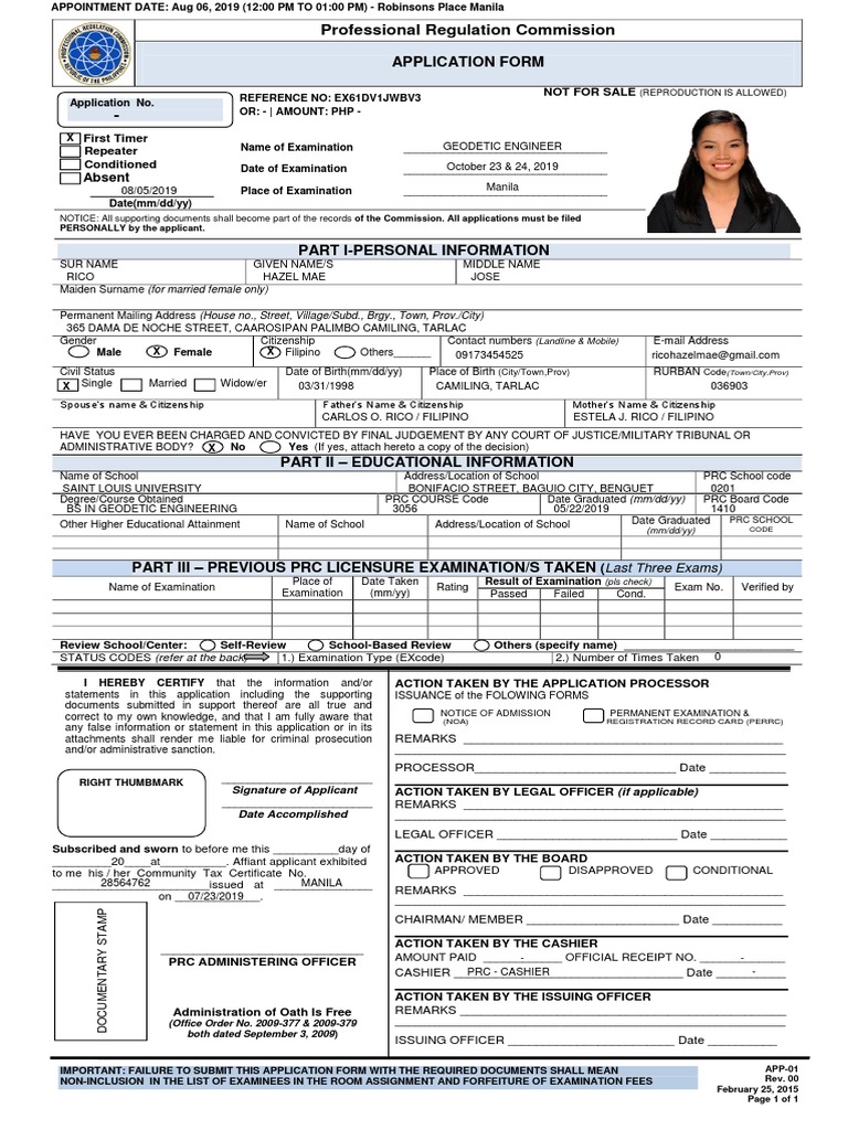 PART III – PREVIOUS PRC LICENSURE EXAMINATION/S TAKEN (Last Three Exams)