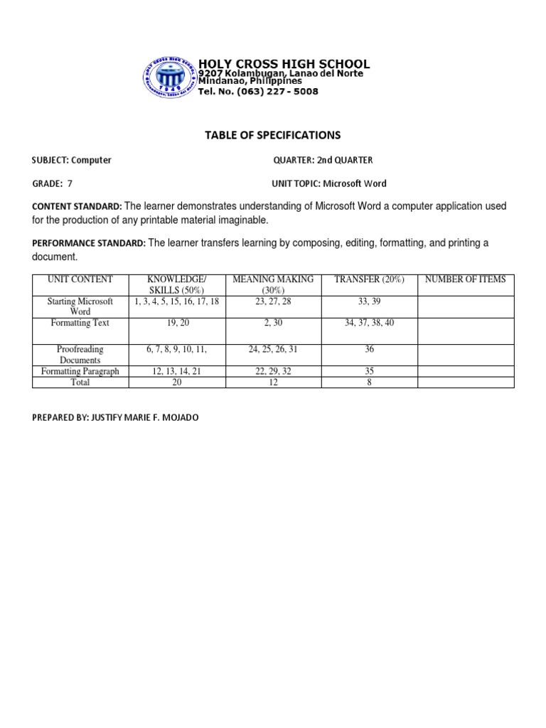 SUBJECT: Computer QUARTER: 2nd QUARTER