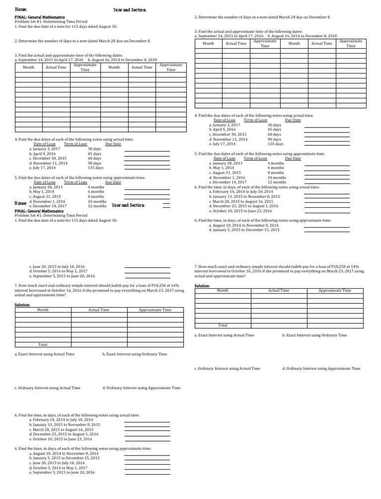 1. Find the due date of a note for 115 days dated August 30. 6. Find the time, in days, of each of the following notes using approximate time: