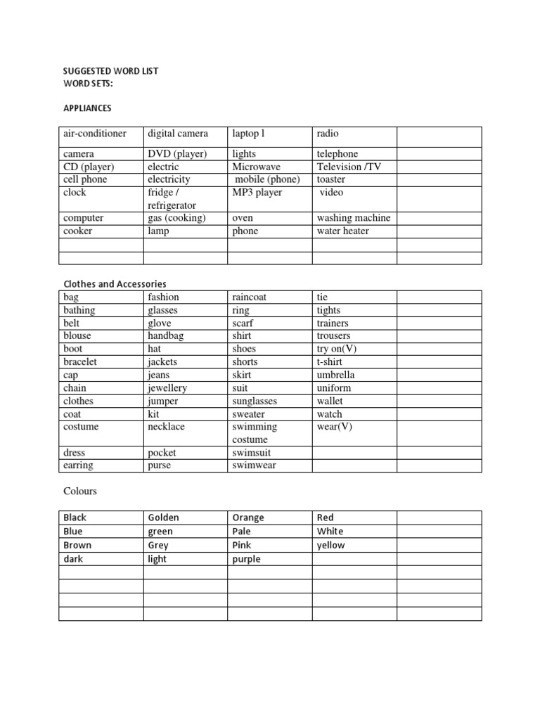 SUGGESTED WORD LIST