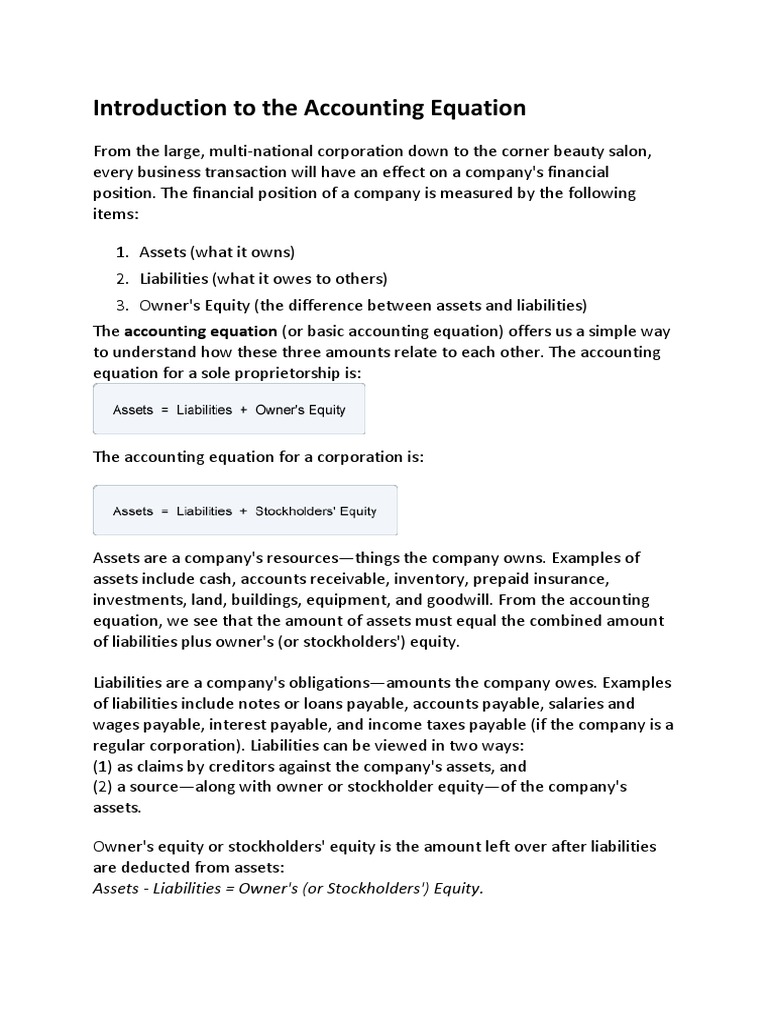 Assets - Liabilities = Owner's (or Stockholders') Equity.
