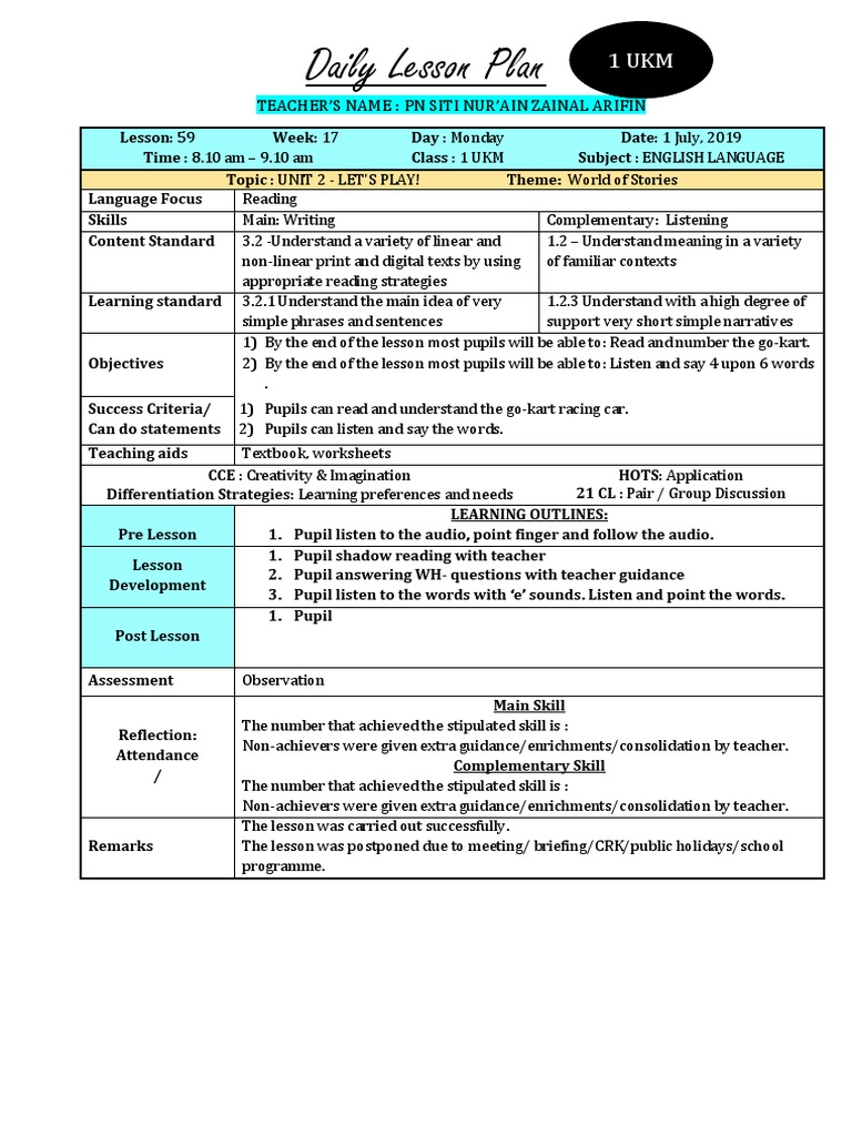 Lesson: 59 Week: 17 Day : Monday Date: 1 July, 2019