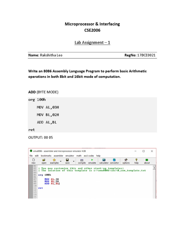 Write an 8086 Assembly Language Program to perform basic Arithmetic