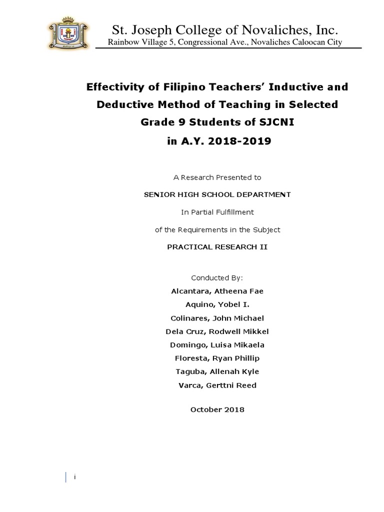 topic “Effectivity of Filipino Subject Teachers’ Inductive and Deductive Method of Teaching in Selected