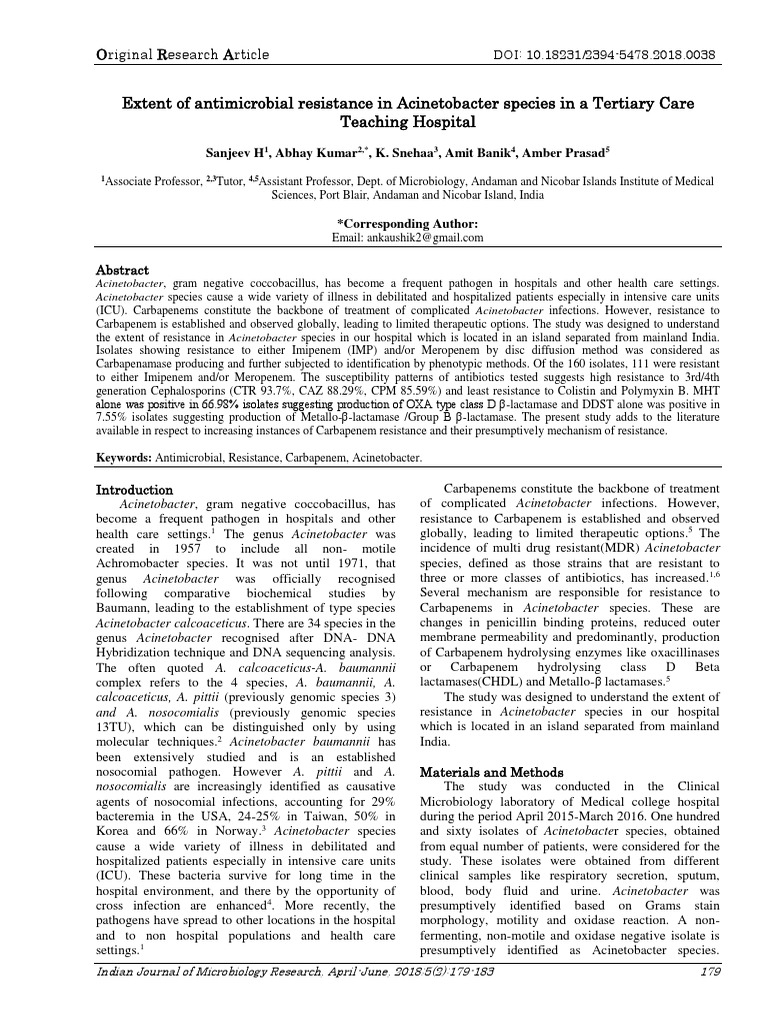 Sanjeev H et al. Extent of antimicrobial resistance in Acinetobacter species