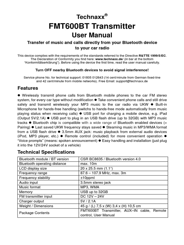 FMT600BT Transmitter, AUX–IN cable, Remote