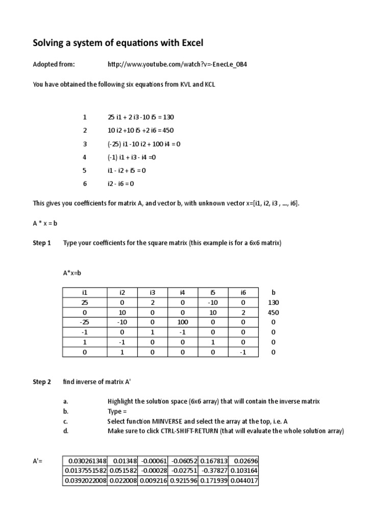 This gives you coefficients for matrix A, and vector b, with unknown vector x=[i1, i2, i3 , …, i6].