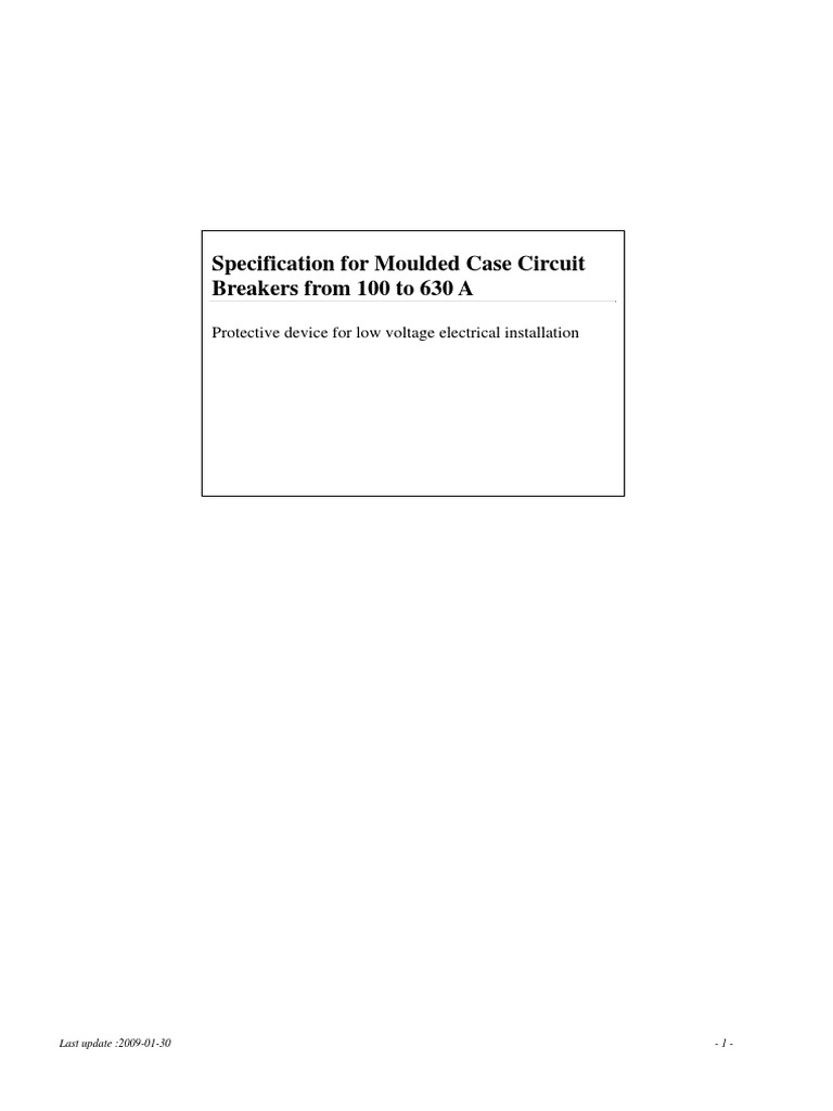 The present specification applies to moulded-case circuit breakers (MCCB) from 100A to 630A for AC (50/60Hz) low voltage