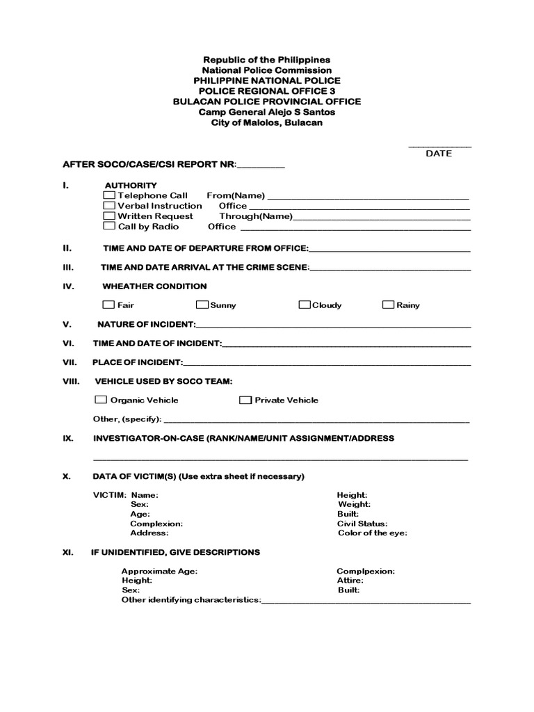 III. TIME AND DATE ARRIVAL AT THE CRIME SCENE:_____________________________________