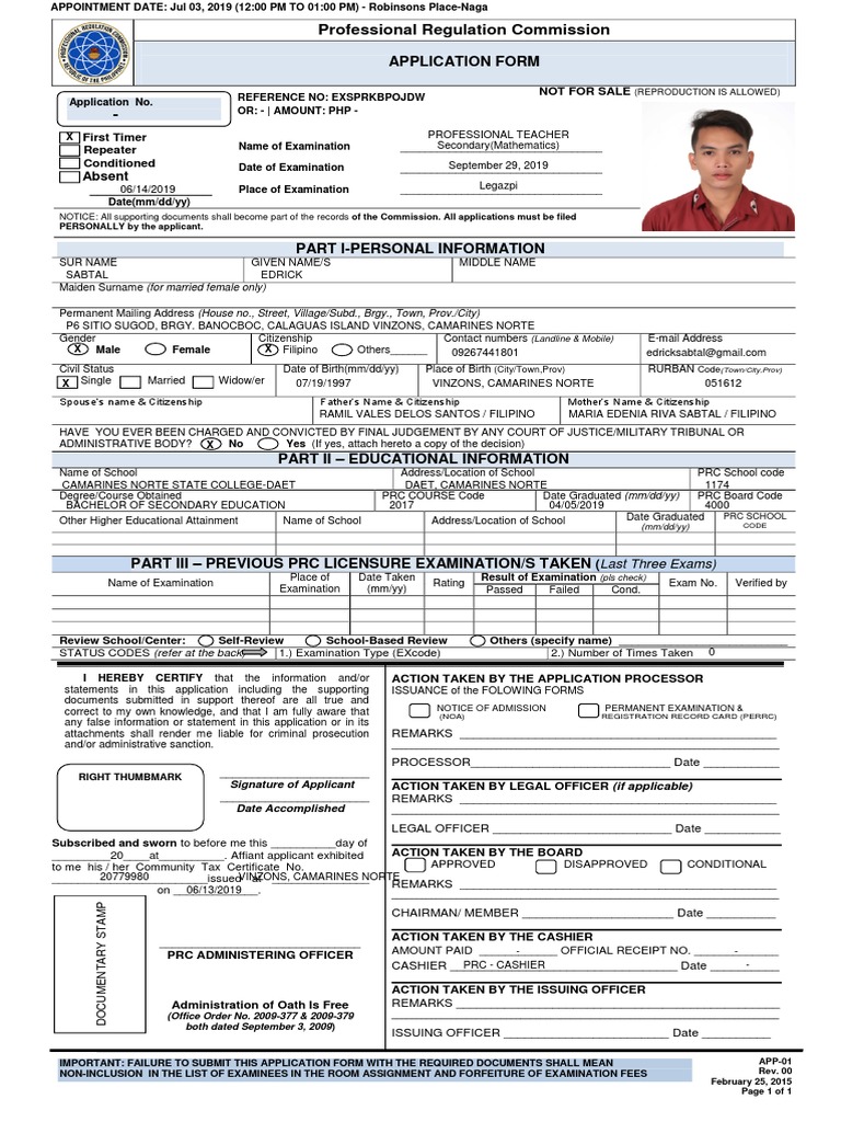 PART III – PREVIOUS PRC LICENSURE EXAMINATION/S TAKEN (Last Three Exams)