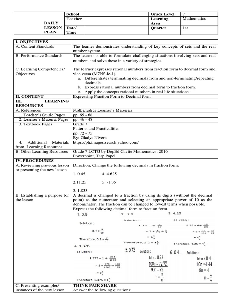 C. Learning Competencies/ The learner expresses rational numbers from fraction form to decimal form and