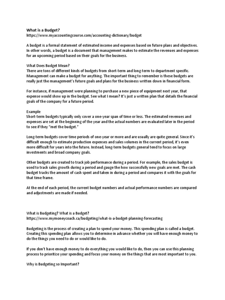 Budgeting is the process of creating a plan to spend your money. This spending plan is called a budget.