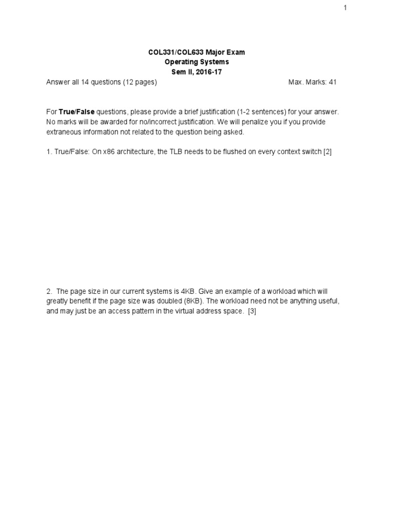 1. True/False: On x86 architecture, the TLB needs to be flushed on every context switch [2]