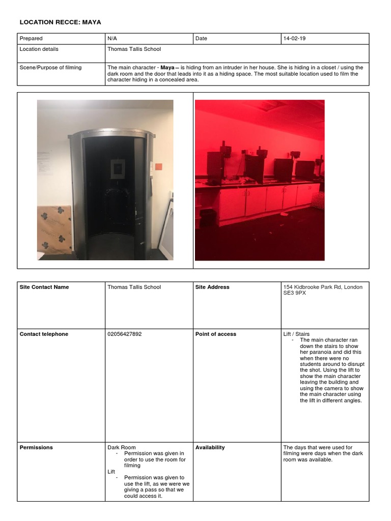 Scene/Purpose of filming The main character - Maya – is hiding from an intruder in her house. She is hiding in a closet / using the