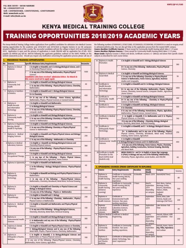 KMTC or other recognized 17 Higher Diploma in Diploma in Orthopaedic 1 Year March 2019 Nairobi 15