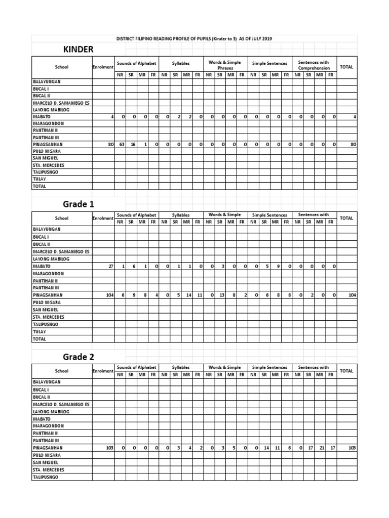DISTRICT FILIPINO READING PROFILE OF PUPILS (Kinder to 3) AS OF JULY 2019