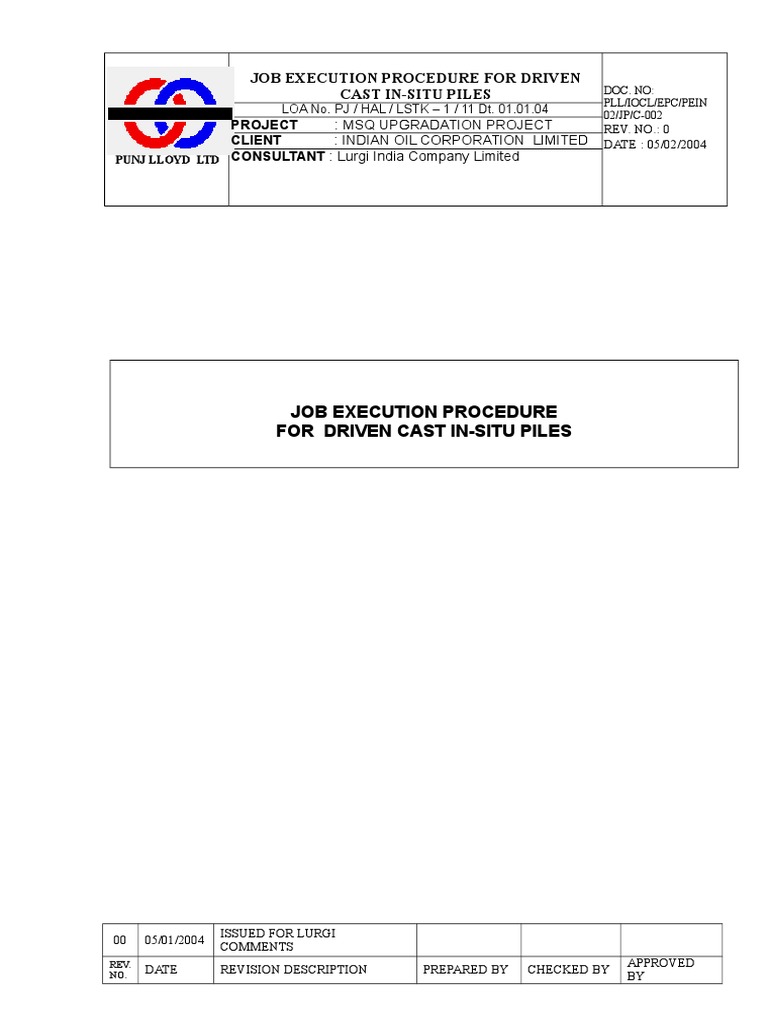 The purpose of this procedure is to ensure that the Driven Cast-In-Situ Pile construction , workmanship and