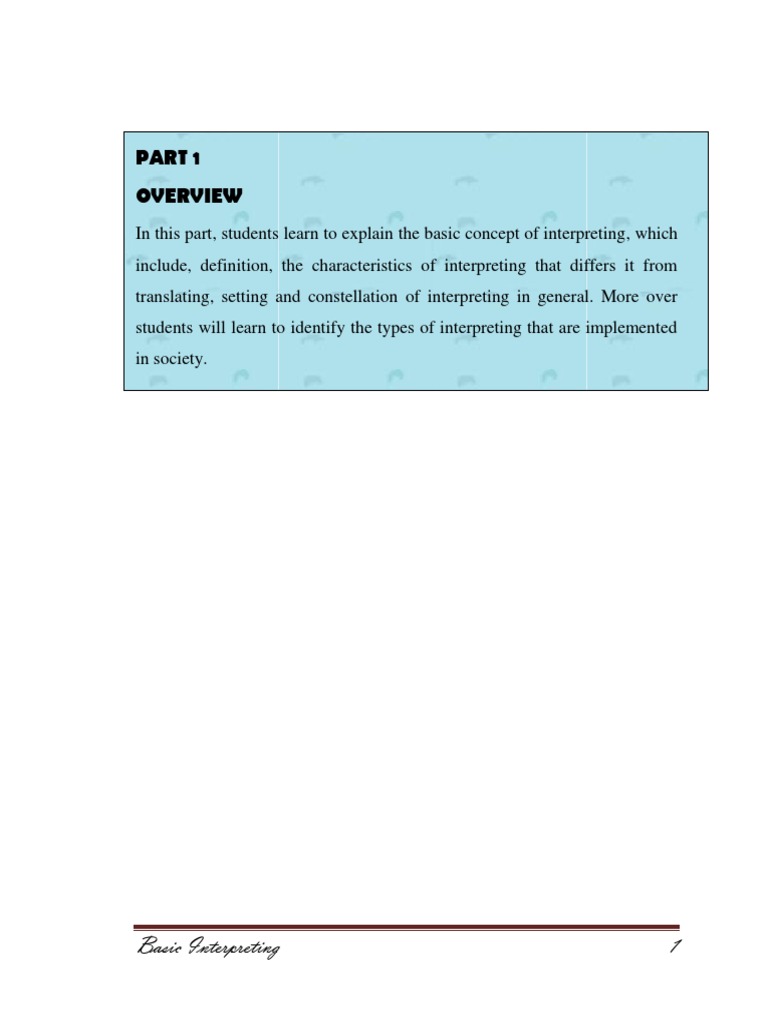 In this part, students learn to explain the basic concept of interpreting, which