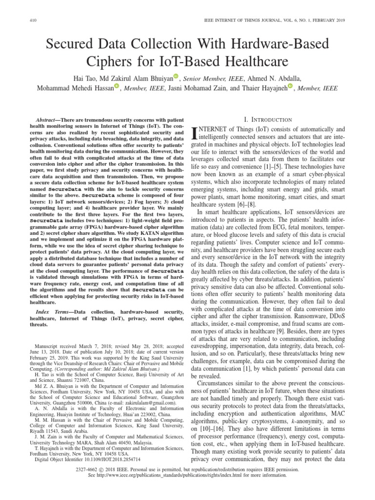 TAO et al.: SECURED DATA COLLECTION WITH HARDWARE-BASED CIPHERS FOR IoT-BASED HEALTHCARE 413