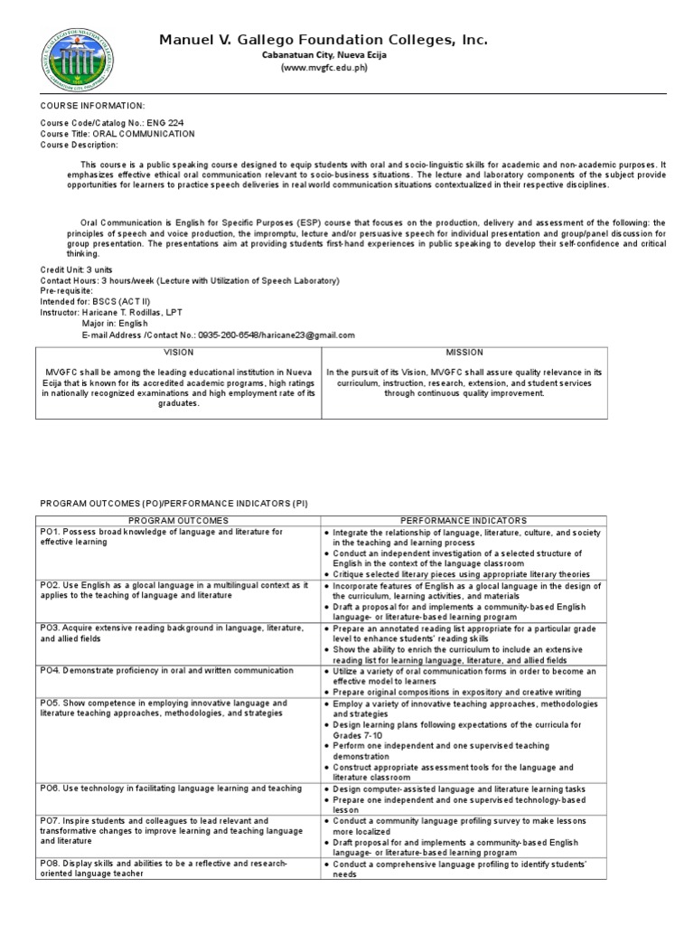 Oral Communication is English for Specific Purposes (ESP) course that focuses on the production, delivery and assessment of the following: the