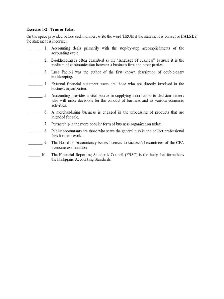 Exercise 2-10 True or False