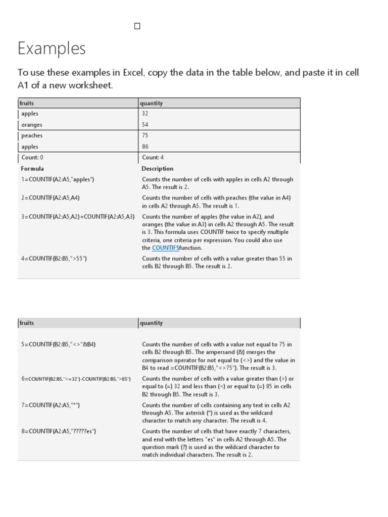 1=COUNTIF(A2:A5,"apples") Counts the number of cells with apples in cells A2 through