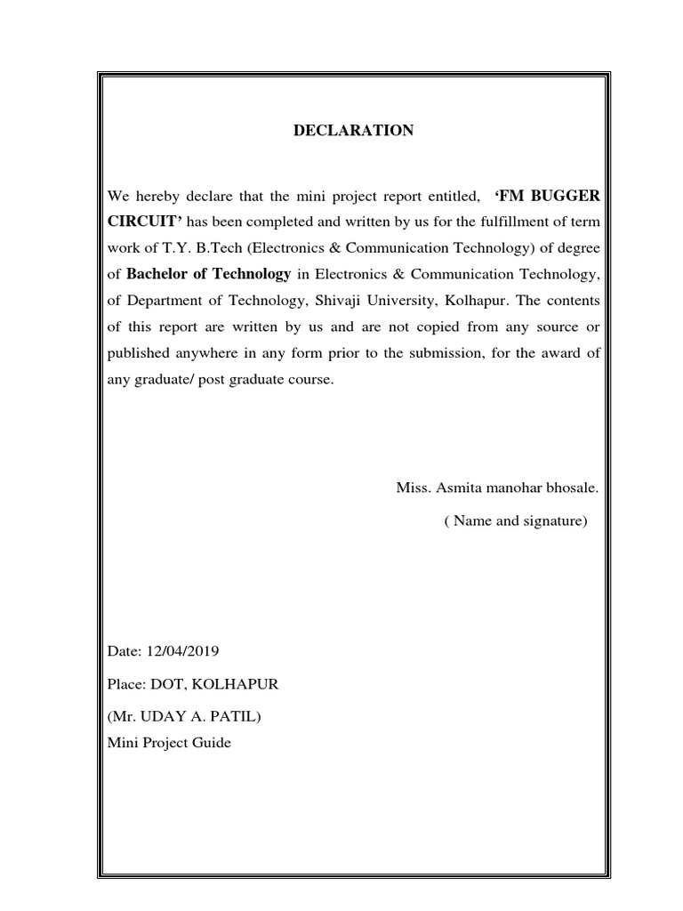 We hereby declare that the mini project report entitled, ‘FM BUGGER