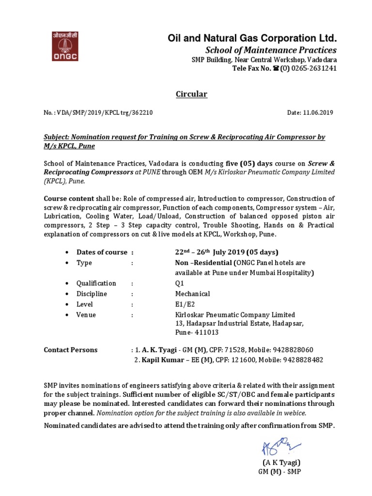 Subject: Nomination request for Training on Screw & Reciprocating Air Compressor by