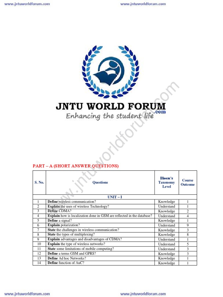 Part - A (Short Answer Questions) : S. No. Questions Bloom's Taxonomy Level Course Outcome