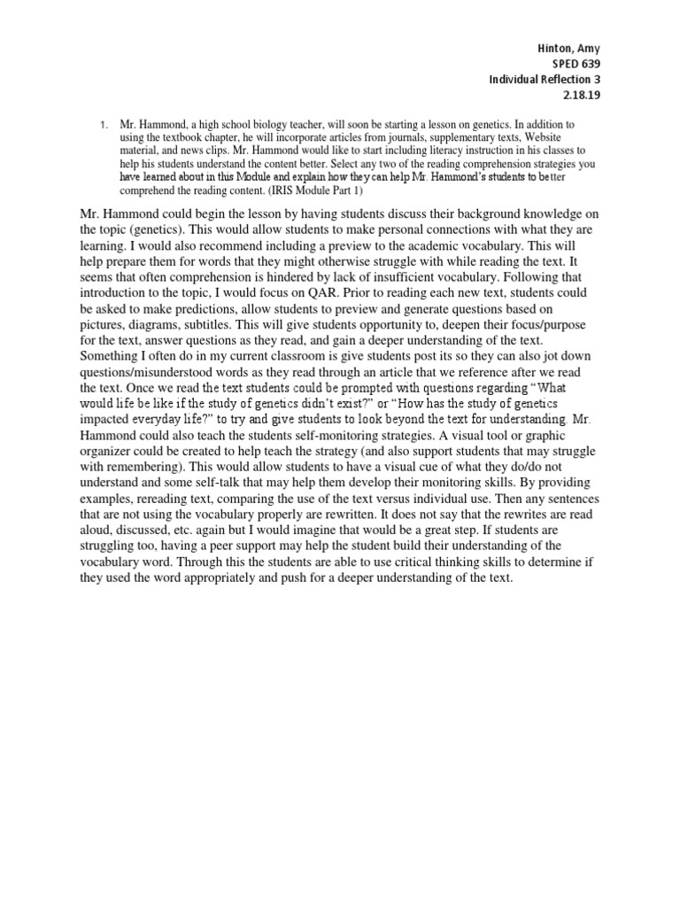 material, and news clips. Mr. Hammond would like to start including literacy instruction in his classes to