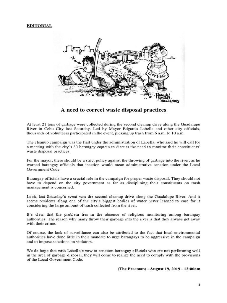 Barangay officials have a crucial role in the campaign for proper waste disposal. They should not