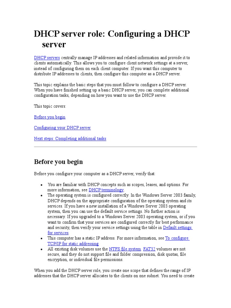 This topic explains the basic steps that you must follow to configure a DHCP server.