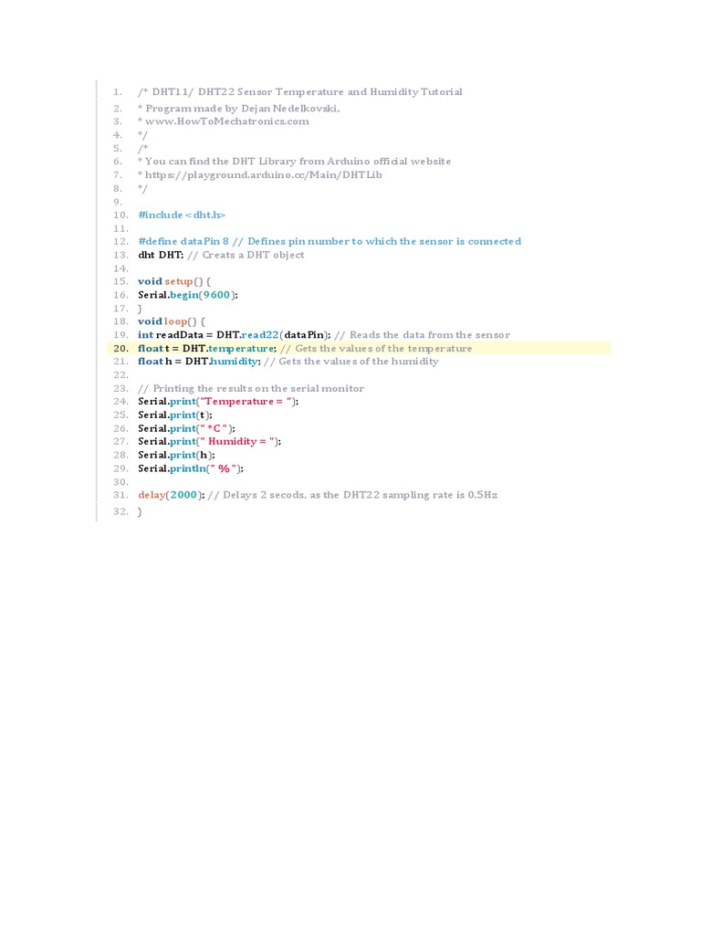 20. float t = DHT.temperature; // Gets the values of the temperature