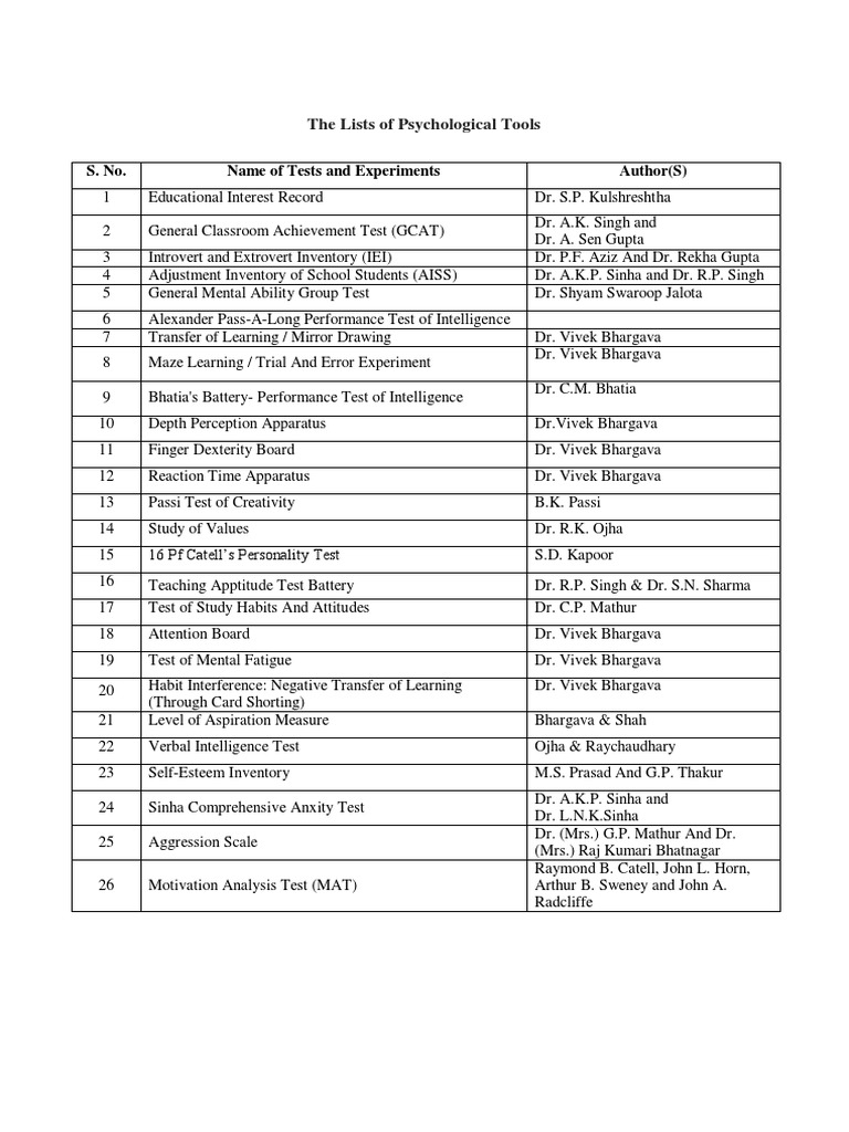 S. No. Name of Tests and Experiments Author(S)
