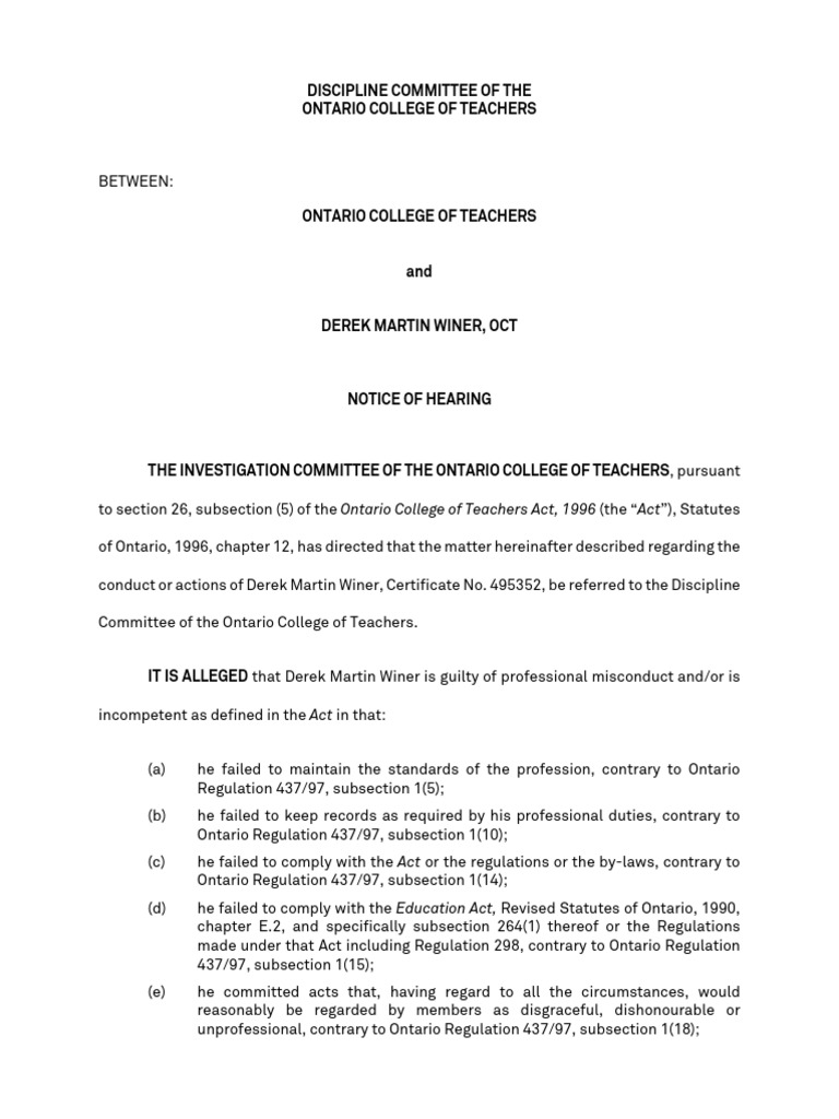 1. Derek Martin Winer (the “Member”) is a member of the Ontario College of Teachers.