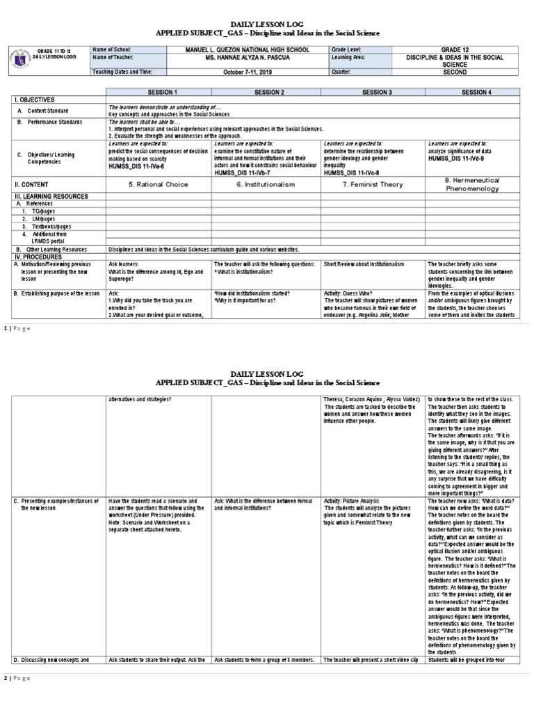 DAILY LESSON LOGS Name of Teacher: MS. HANNAE ALYZA N. PASCUA Learning Area: DISCIPLINE & IDEAS IN THE SOCIAL