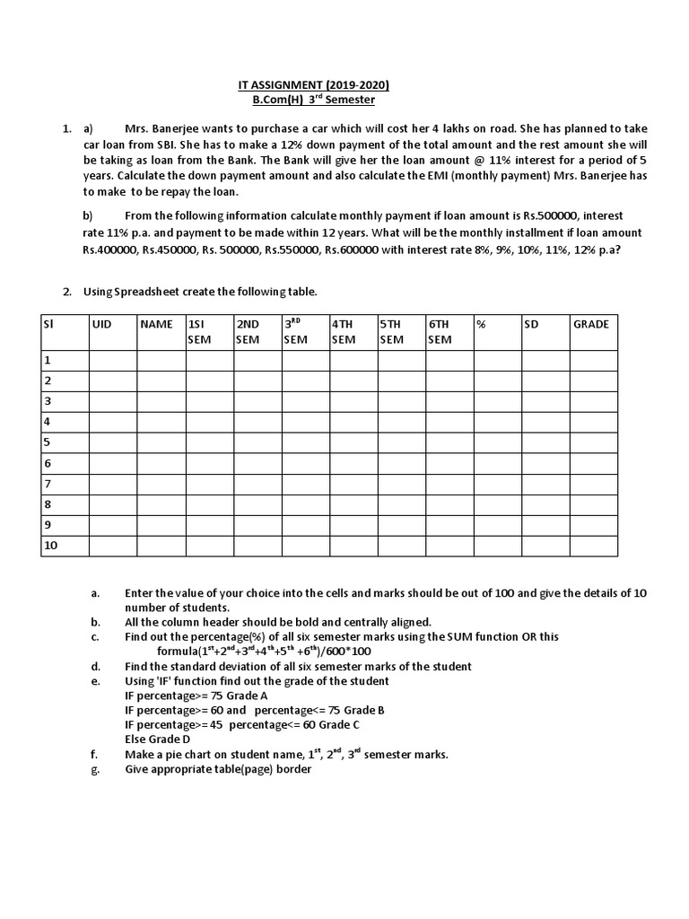 a. Enter the value of your choice into the cells and marks should be out of 100 and give the details of 10