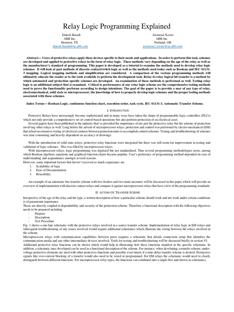 the manufacturer’s standard of programming. This paper is developed as a tutorial to examine the methods used to develop relay logic
