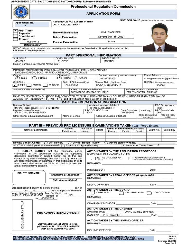 PART III – PREVIOUS PRC LICENSURE EXAMINATION/S TAKEN (Last Three Exams)