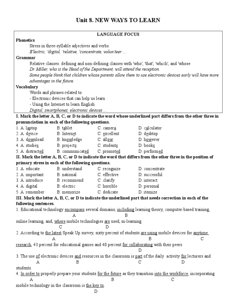 IV. Mark the letter A, B, C, or D to indicate the correct answer to each of the following sentences.