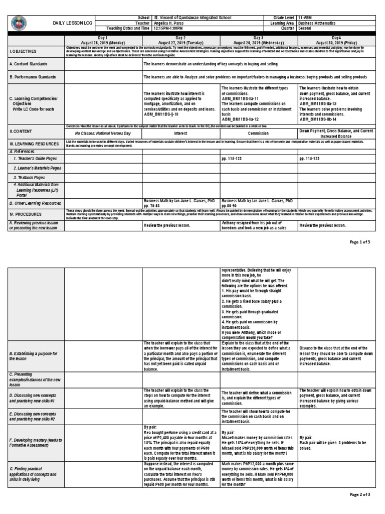 DAILY LESSON LOG Teacher Angelica H. Paras Learning Area Business Mathematics