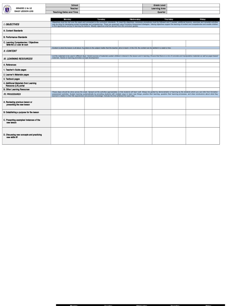 Objectives must be met over the week and connected to the curriculum standards. To meet the objectives, necessary procedures must be followed and if needed, additional lessons, exercises and remedial activities