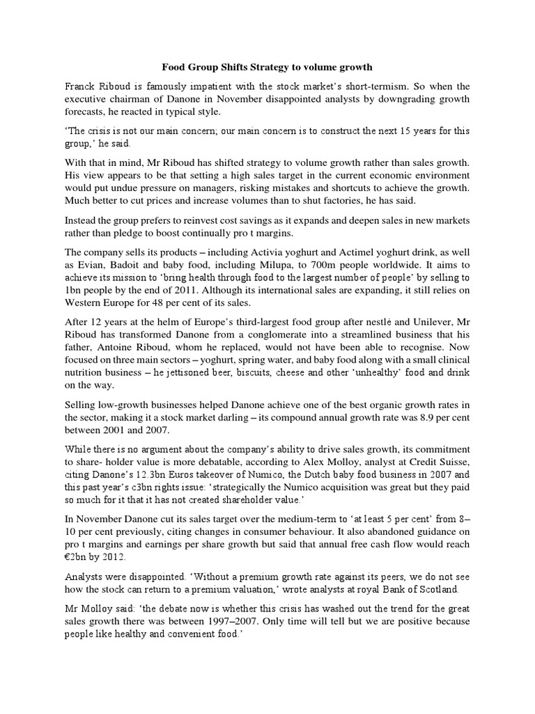 With that in mind, Mr Riboud has shifted strategy to volume growth rather than sales growth.