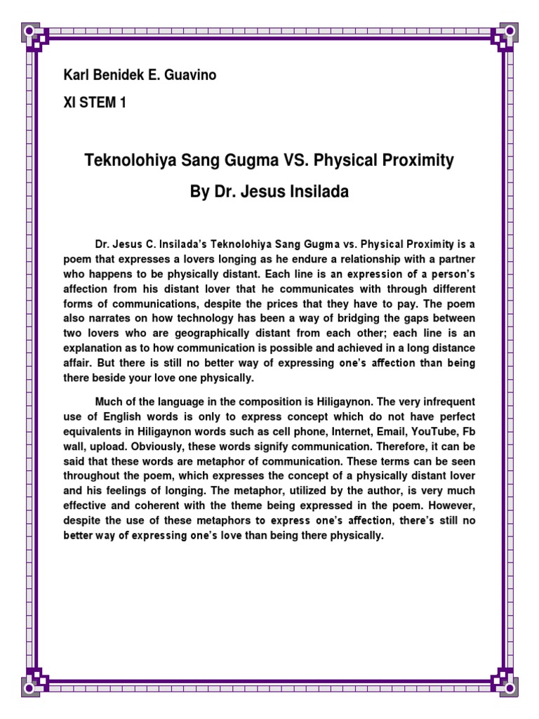 Dr. Jesus C. Insilada’s Teknolohiya Sang Gugma vs. Physical Proximity is a